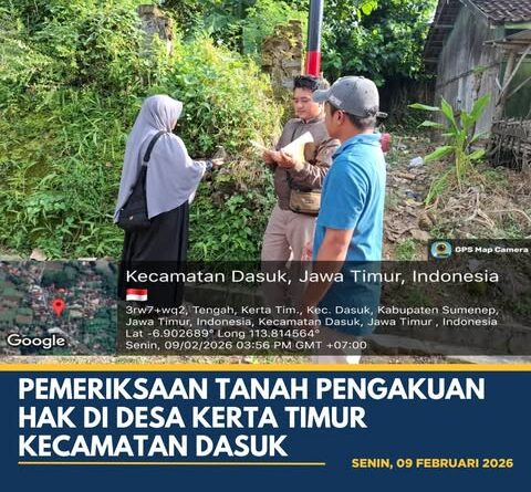 SUMENEP – Dalam upaya memberikan kepastian hukum atas kepemilikan tanah masyarakat, Kantor Pertanahan (Kantah) Kabupaten Sumenep kembali melakukan peninjauan lapangan. Pada Senin, 9 Februari 2026, tim petugas melakukan kegiatan Pemeriksaan Tanah Pengakuan Hak yang berlokasi di Desa Kerta Timur, Kecamatan Dasuk.